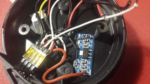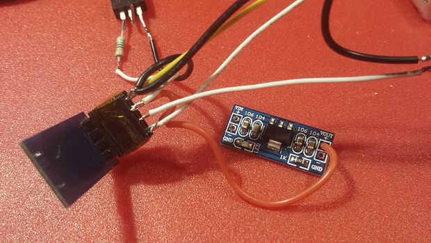Conecte el cable rojo de VCC del módulo a la salida (VOUT) del regulador de voltaje. Como se puede ver, he tenido que recortar las esquinas un poco para hacer ajuste, pero ahora se quepa comodamente en lugar entre los postes de plástico. Tenga cuidado aquí, para que no corte ningún rastro en el regulador, y usted no corta nada!