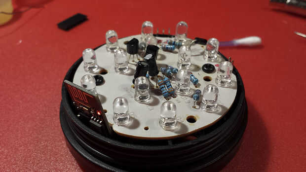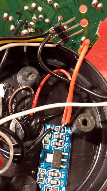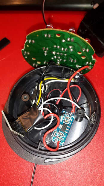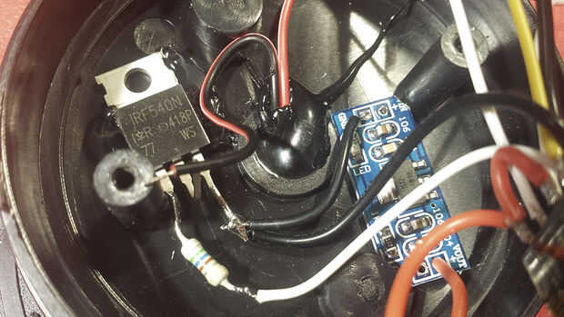 Comenzar pegando el mosfet en la parte inferior de la luz estroboscópica. Ninguna gran corriente continua fluye aquí, así que no necesita un disipador de calor. Conecte la entrada negativa del regulador de voltaje (GND) a la fuente de lo mosfet. Lo que no es mostrado en la imagen, tome el cable de entrada de energía negativa (negro) y conectar también a la fuente. He utilizado el cable de la fuente como una clase de tablero de arranque, que está conectado todo terreno.