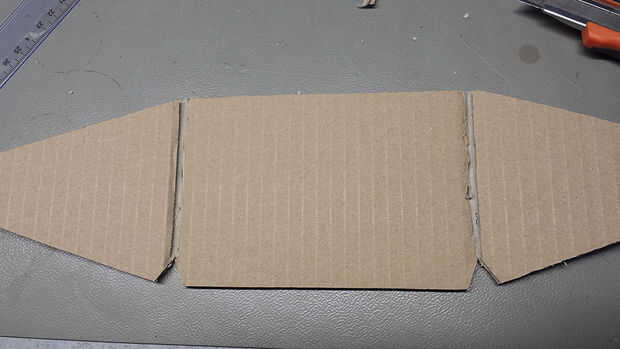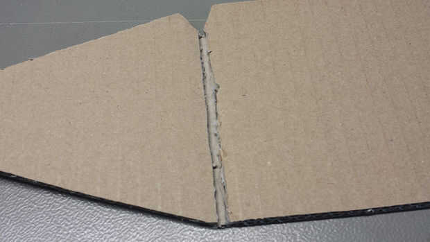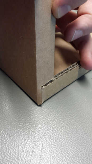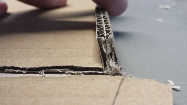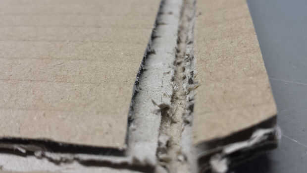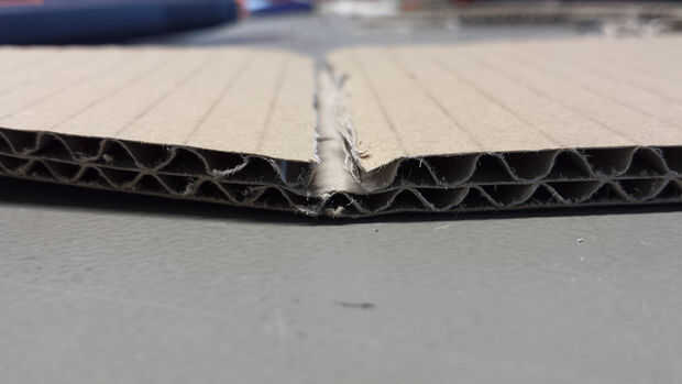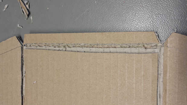 Pero cortar las lengüetas laterales es más difícil, porque estamos cortando perpendicularmente a las líneas y no plegar juntos tan bien. Por lo tanto, utilizamos la misma técnica, pero esta vez que nos estamos cortando a través de ambas capas, dejando sólo el papel de inferior en su lugar. Lo primero Haz un corte ancho ~ 4mm alrededor de la línea de pliegue principal hasta la capa inferior, pero tomar mucho cuidado para no pasar por ella. Luego además corté a unos 4mm de la capa superior (en el lado del cuerpo de soporte).