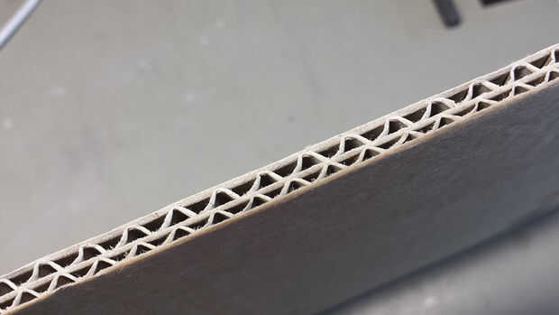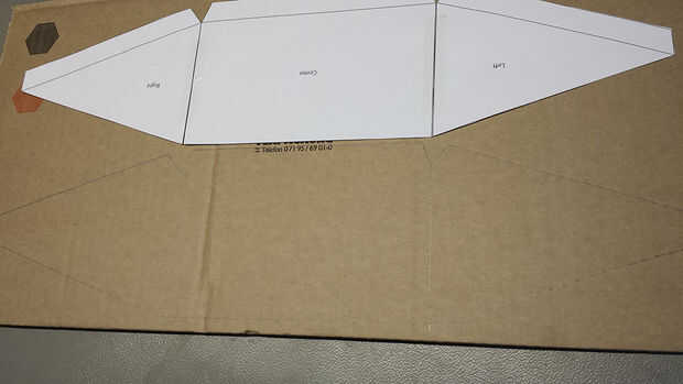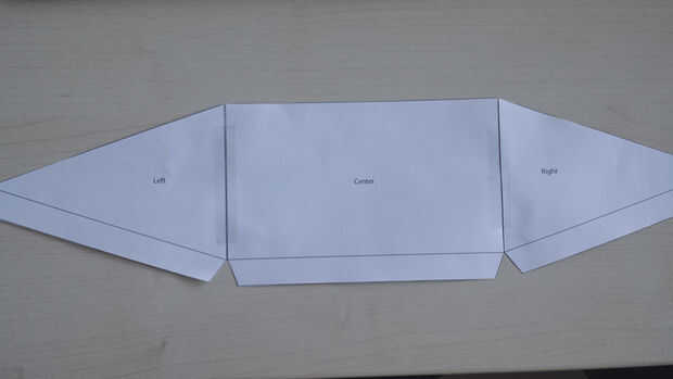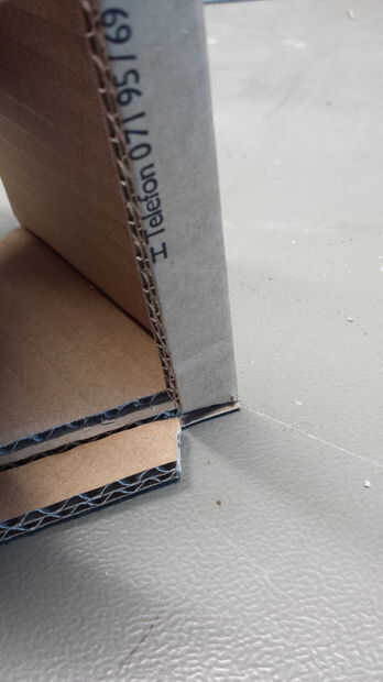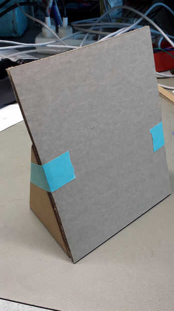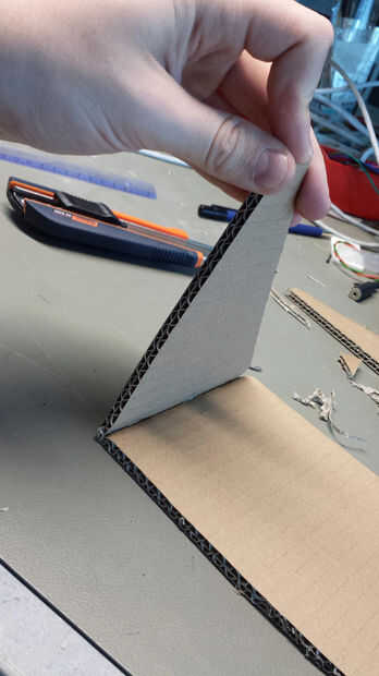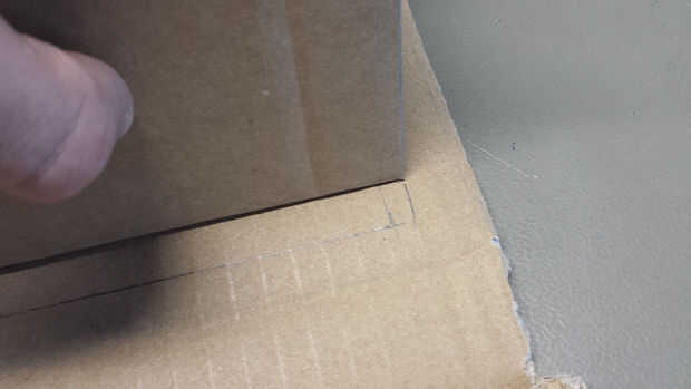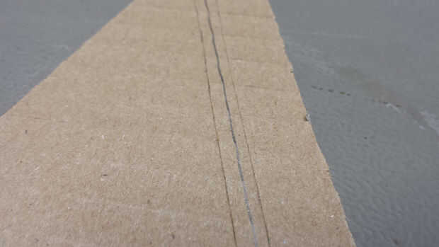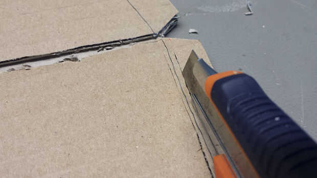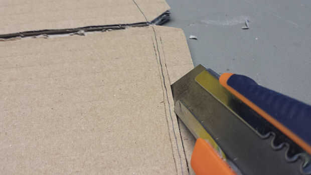 Unir las tres piezas del soporte. Robar de su trabajo obtener un pedazo de cartón (idealmente el resistente de dos capas), que se adapta al soporte y una hoja A5. Mina vino de alguna caja de transporte. Trace la plantilla de soporte junto con las líneas de plegado y corte hacia fuera. Ahora viene la parte tediosa y diversión. Tenemos que marcar y limpiar cada pliegue en el interior, por lo que puede doblar muy bien en el ángulo de 90°. Para los dos pliegues principales (entre la base y los dos triángulos), he utilizado la siguiente técnica: en primer lugar, hacer dos cortes paralelos, cada uno de aproximadamente 2mm desde la línea de doblez. Sostenga el cuchillo vertical y no se olvide de ir sólo a través de la primera capa de cartón. Repita el corte, pero ahora tienen el cuchillo en un ángulo de 45° y otra vez, asegúrese de ir sólo a través de la primera capa. Ahora la tira de cartón sólo debe caerse. Esto es más fácil, porque nos estamos corte paralelos a las líneas de cartón.