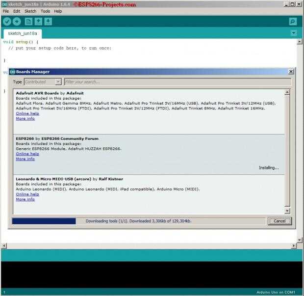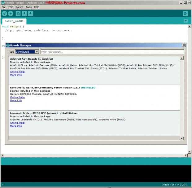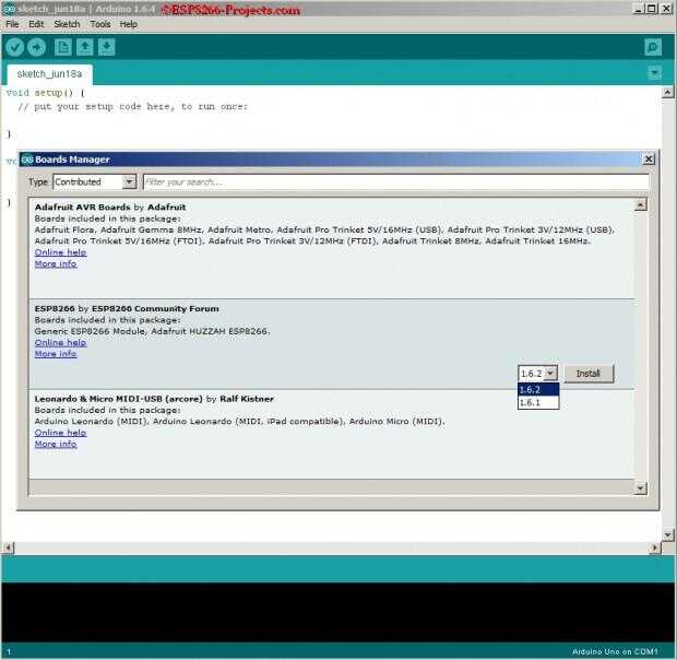 -Seleccione el ESP8266 por el foro de la comunidad de ESP8266 y versión 1.6.2