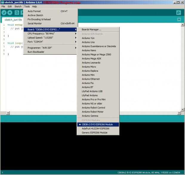 -Seleccione la placa como ADAFRUIT HUZZAH ESP8266 o el módulo de GenericESP8266. Para uso de EVO CBDBv2 archivo de configuración o GenericESP8266.