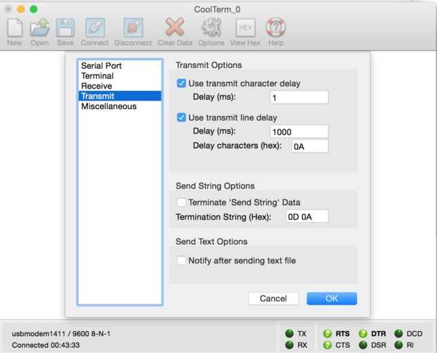 Poner estos código en un archivo (archivo de texto) y nos enviará el archivo de texto para el ESP8266 con CoolTerm. Asegúrese de que la conexión -> Opciones > transmitir ajustes permiten un retraso por lo que las líneas pueden ser transmitidas sin error, ver primer imagen.