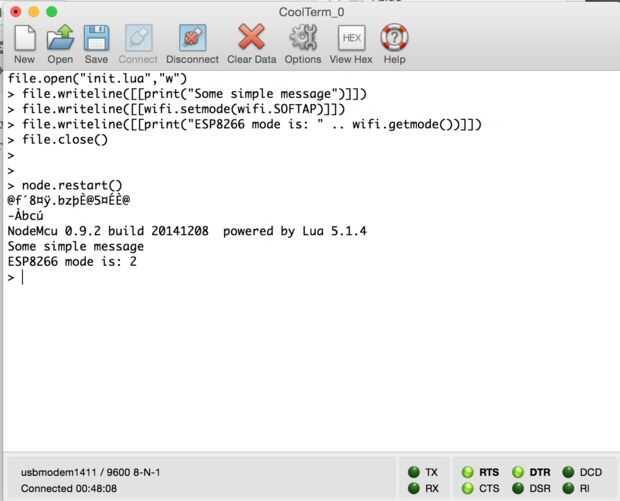 Veamos un ejemplo muy simple de programación del módulo. Vamos a utilizar la funcionalidad de arranque construida en el firmware LUA como sigue: