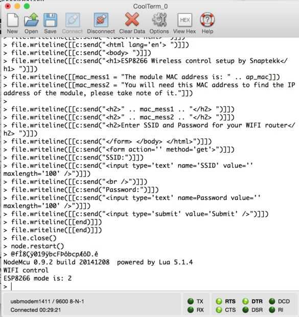 Cargue el archivo con el código escrito anteriormente como se explica en parte. Una vez que el archivo se envía al módulo se debe hacer un node.restart() y verá que el ESP8266 está ahora en modo 2 o modo AP, servidor.