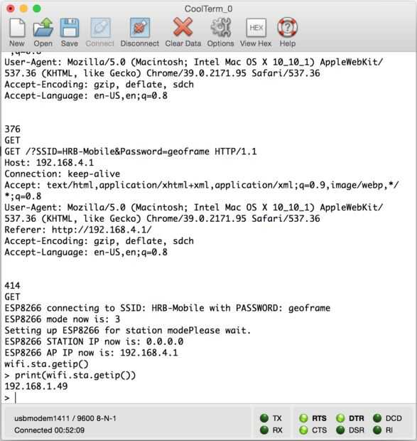 Después de unos segundos de espera debe recibir un mensaje en el navegador con la dirección IP asignada al módulo por tu router; Si usted consigue un 0.0.0.0, sólo actualizar el navegador apuntando a 192.168.4.1 y debe obtener la nueva dirección IP. Ya que para esta prueba estamos supervisando la ESP8266 a través de un terminal serial, permite comprobar lo que era la salida: