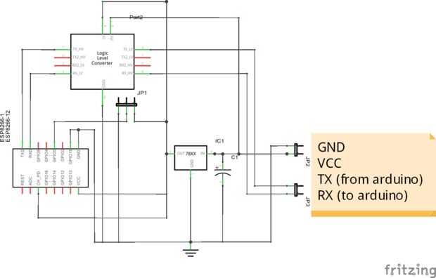 Nota 1: puse el convertidor de lógica sólo para el cable TX del Arduino a la ESP8266, porque es prohibido y peligroso alto voltaje unidad en éste. Pero para el cable de la ESP8266 con el Arduino no monte un transistor convertidor de nivel de lógica. En cambio, el cable va directamente desde el pin TX en ESP-12 a la RX del Arduino. Funciona porque V_In_High (la más baja tensión de entrada a considerar "1") es 3V en el Arduino, para que 3.3V que sale de la ESP-12 es suficiente. Para estar en el lado seguro para altas tasas de datos pongo otro convertidor.