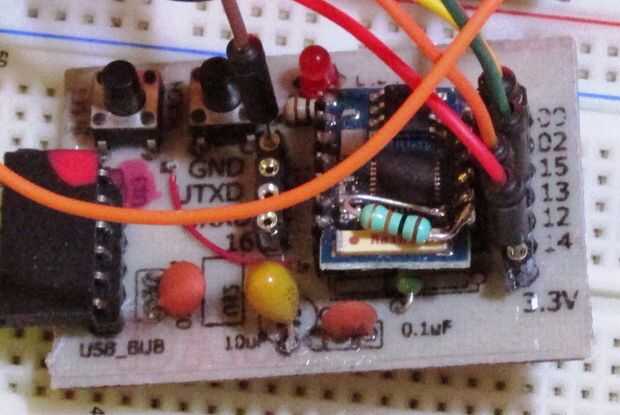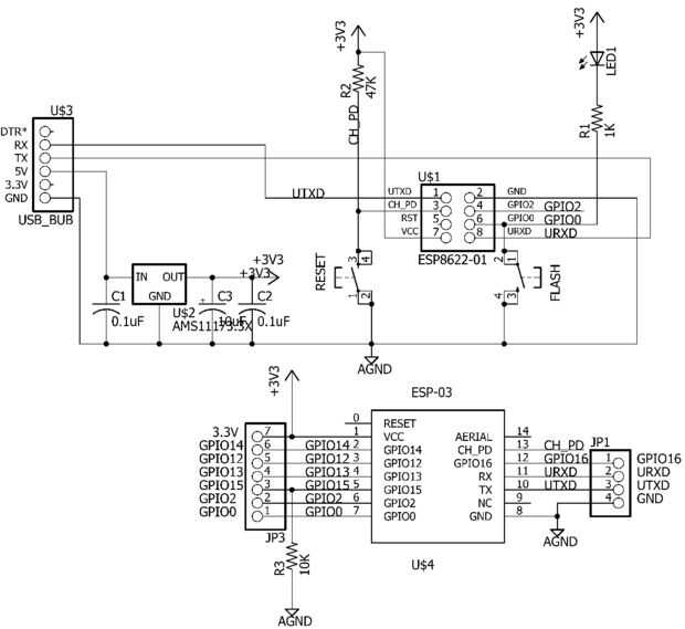 Así que decidí hacer un PCB para la 01 ESP y ESP-03 por lo que pude programarlos y hacer algunos prototipos básicos. Esto se basa en la programación en el primer ESP8266 como Arduino Instructable. Ver esquema y fotos.