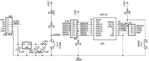 De todos modos, decidió mantener a éste para programar el ESP-01s, pero hizo sólo otro PCB para ESP-03s. Ver esquema y cuadro. Esto funciona muy bien.