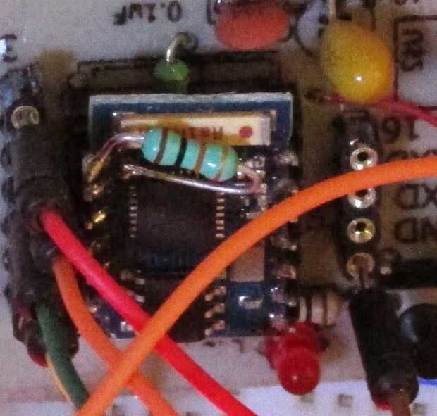 He añadido una resistencia de 10K entre el VCC y el botón de Reset. Bueno, esto es realmente muy feo pero parece funcionar. Me han pedido algunos resistores SMD de 10K y que harán de este un poco más ordenado.