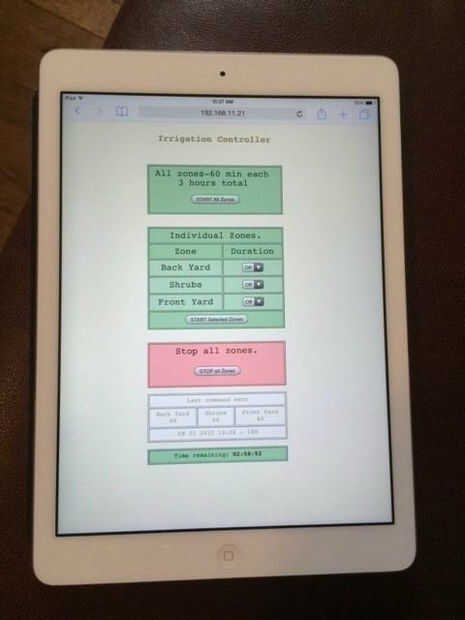 Este sistema también es capaz de hacer 'manual' en paseos como el evento programado de detener o iniciar manualmente el proceso. Eventos de la vida, como el perro que necesita ir por negocios o por un período seco prolongado, que requieran más agua de lo habitual. Parece que una plétora de eventos inesperados puede causar mi esposa agarrar la linterna y desaparecer en la noche para activar manualmente el sistema de riego.
