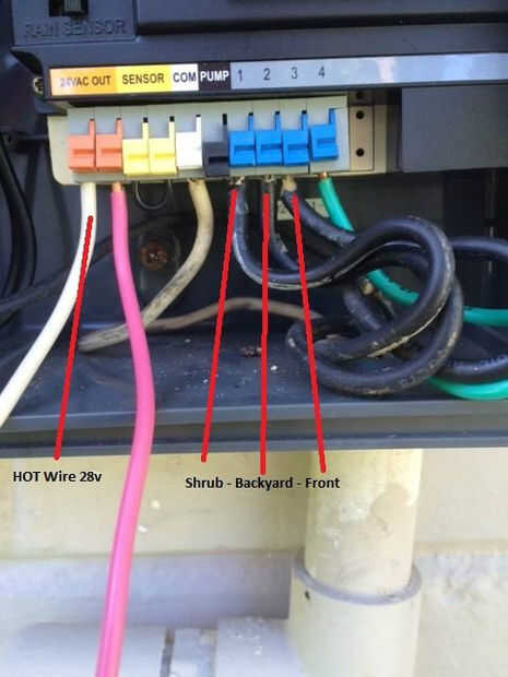 Como he mencionado anteriormente, utilizo un controlador de órbita para controlar el sistema existente. Esta unidad puede controlar cuatro zonas. Sólo uso tres en este momento. El sistema se ejecuta en 24 VCA de un transformador de ladrillo. Este ladrillo sin una carga sustancial está entregando alrededor de ~ 28vac.
