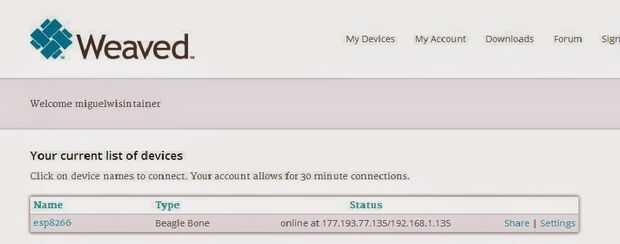 Entrar en el developer.weaved.com, introduzca usuario y contraseña y seleccione el dispositivo ES8266.