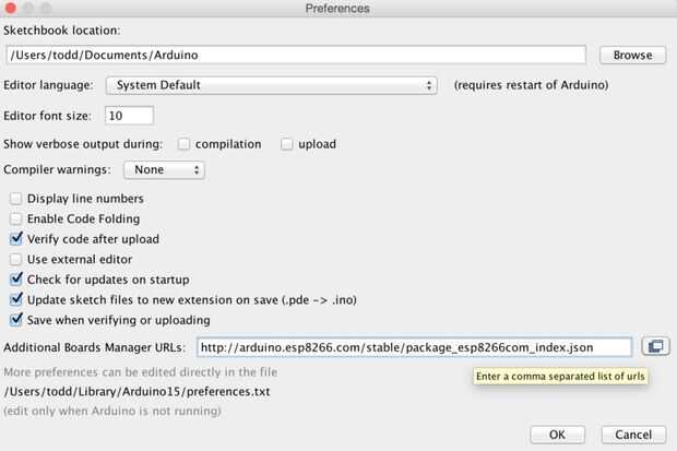 en campo de adicional URL Manager Board Arduino v1.6.4 + preferencias.