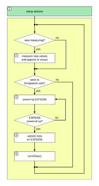 El Arduino es el dispositivo de medición. Lee todos los valores del sensor y calcula el promedio sobre un período de tiempo específico (en movimiento o balanceo medio). También establece la ESP01 dormir y despertar otra vez.