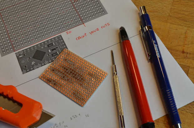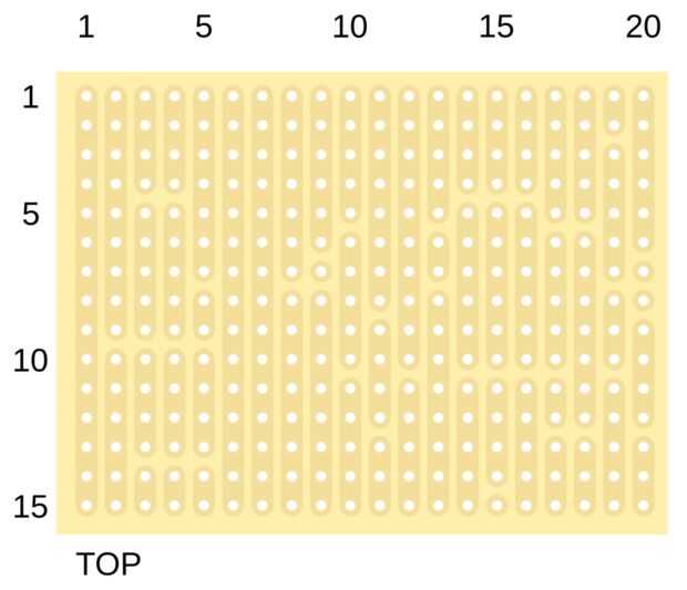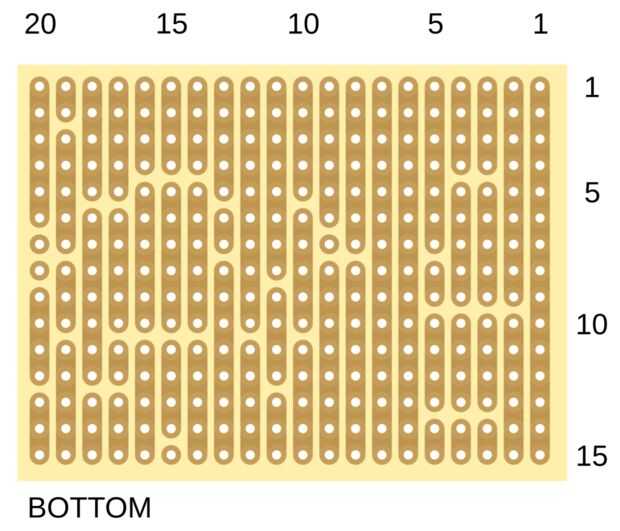 Primero corte las franjas de la placa perforada en la posición indicada en el dibujo. Para hacerlo más fácil utilizar la imagen de más abajo. Al final la cuenta sus recortes para asegurarse de que usted no tenga conexiones equivocadas.