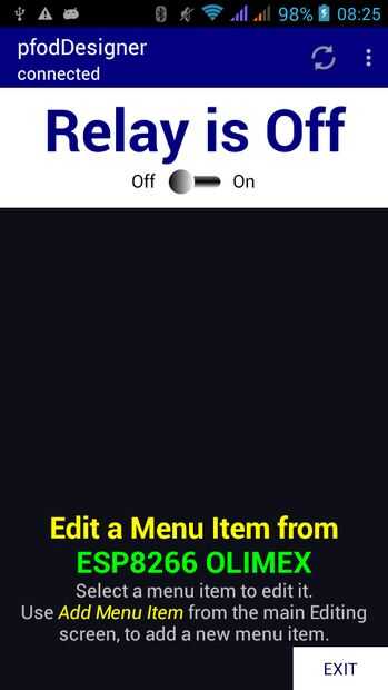 Usando el pfodDesigner, se pueden diseñar usted propio menú y submenús, para el control de cualquiera de los pernos de OLIMEX.