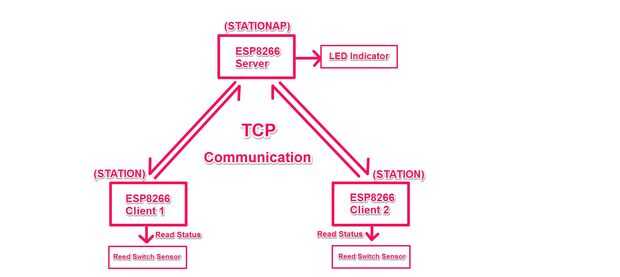 La solución técnica como la imagen adjunta. ESP8266 server se debe establecer como modo de AP, se puede construir una comunicación TCP con otros clientes de ESP8266. Los clientes deben trabajar para lectura del estado de los sensores, luego retroalimentación al servidor. y servidor controla LED para mostrarlo.