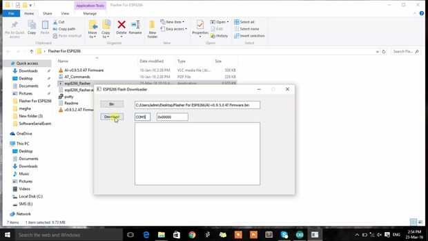Después de eso, Abra esp8266_flasher en esa carpeta. Y que seleccione el archivo bin es decir, la versión de firmware que desea actualizar y también proporcionar el puerto COM. Será el mismo puerto en el que está conectado el Arduino. Que haga clic en el botón de descarga.