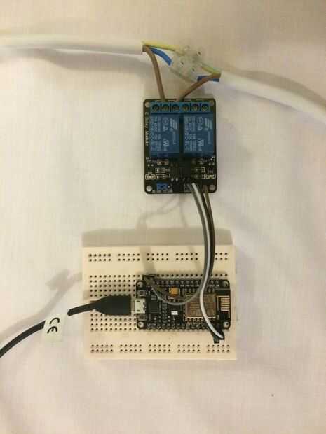 La placa de relé tiene algunas conexiones fáciles y agradables: In1, In2, VCC, GND. GND conectar a uno de los terminales GND en el ESP del tablero y conectar VCC a la conexión de VIN (esto es 5V en comparación con 3,3 v de la ESP, pero no se disparará el relé con esta baja tensión). Conectar In1 y In2 a D0 y D1 en la Junta ESP.