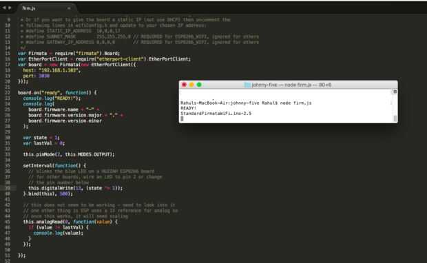 Así que ahora después de centellear su ESP8266 junta con el firmware StandardFirmataWifi y podemos ejecutar el script de Johnny cinco básico.