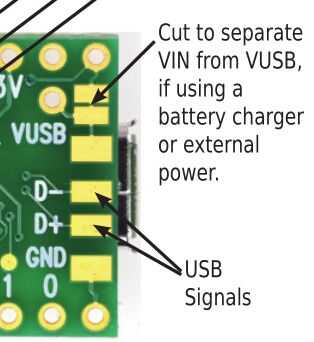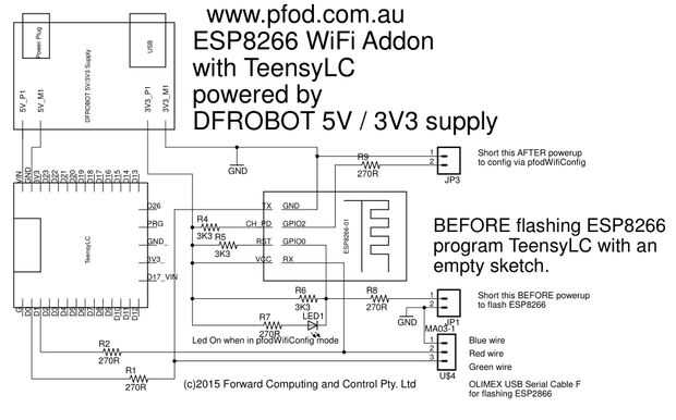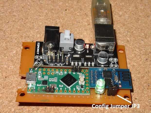 El puente de configuración, JP3, para conexión a tierra GPIO2 (a través de un resistor de 270 ohm) se muestra inferior derecha, junto a la configuración del Led que se enciende cuando el módulo está en modo de pfodWifiConfig. La pista de Teensy-LC VIN-VUSB fue cortada, como se muestra arriba porque el Teensy-LC es alimentada desde la fuente de alimentación DFROBOT.