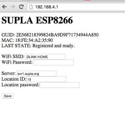 - Ir a http://192.168.4.1 y entrar datos de acceso de tu casa WiFi tener identificador de acceso, contraseña y ubicación de Internet obtenida de cloud.supla.org en el formulario. Haga clic en "Guardar".