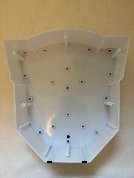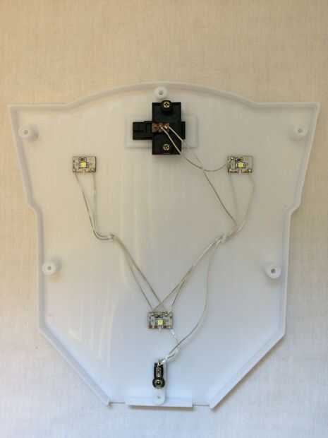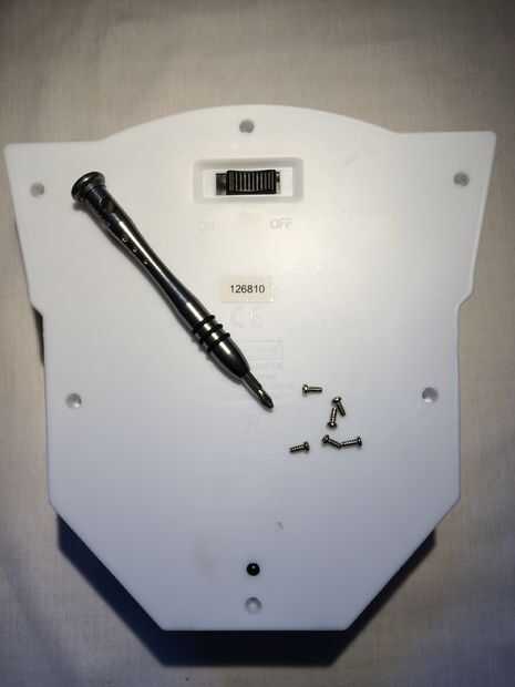 Primero debe desmontar la luz. Hay 6 tornillos pequeños sosteniendo la placa trasera en la unidad. Retirarlos con cuidado y reservamos para más adelante. Entonces se pueden separar las dos partes. Interior se encuentra el conector de alimentación en la parte inferior, con el centro positivo de la fuente conectado al interruptor en la parte superior y finalmente tres LEDs blancos.