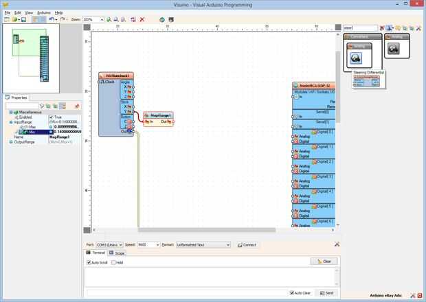3. Conectar la clavija "a" del componente MapRange1 en la clavija de entrada de "velocidad" del componente Steering1 (foto 3)