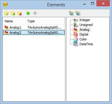 3. En los "elementos" editor seleccione la "analógica" elemento y luego haga clic 2 veces en el "+" botón (imagen 3) para agregar elementos analógico 2 (cuadro 4)