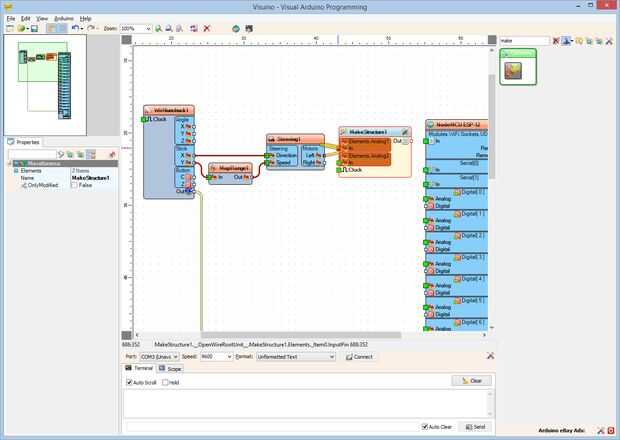 2. Conectar la clavija de "derecho" de la lista de pin de "motores" del componente Steering1 en el perno "en" del canal "Elements.Analog2" del componente MakeStructure1 (foto 2)