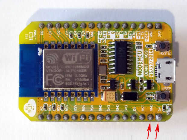 4. Conecte el otro extremo del cable(cable rojo) a 5V(llamado "Vin" en la versión 1.0) Pin de alimentación del módulo de NodeMCU de ESP8266 (foto 3)