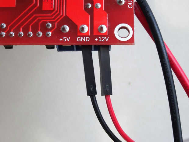 1. Conecte el extremo macho de un hembra-macho cable(cable rojo) al + 12V Power Pin del Módulo del controlador Motor L298N (foto 1 y 2)