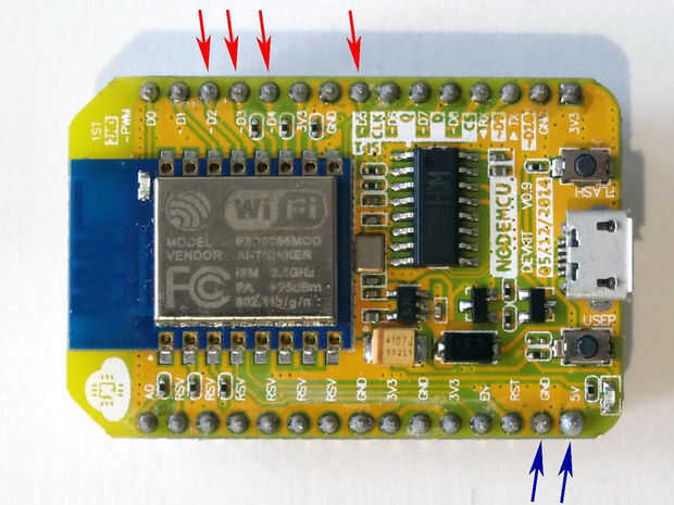 10. Cuadro 4 muestra en rojo los pines NodeMCU 0.9que mercancías conectan en este paso. En azul se muestran las conexiones en el paso anterior