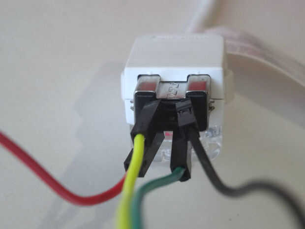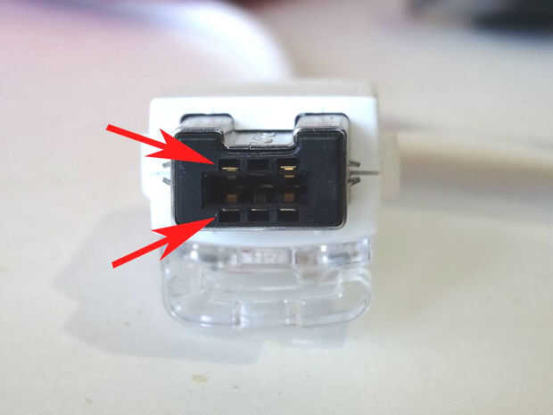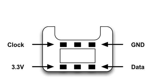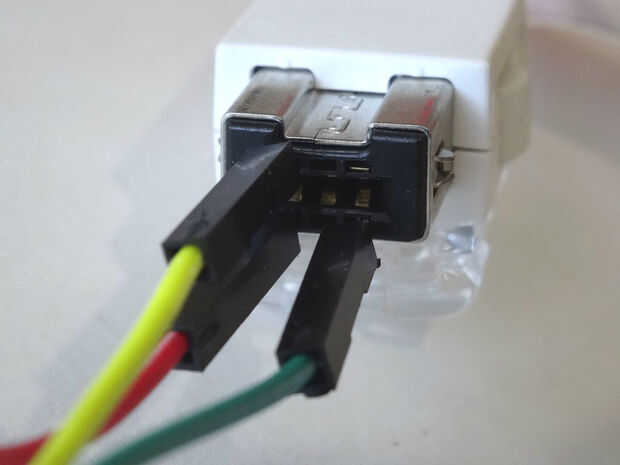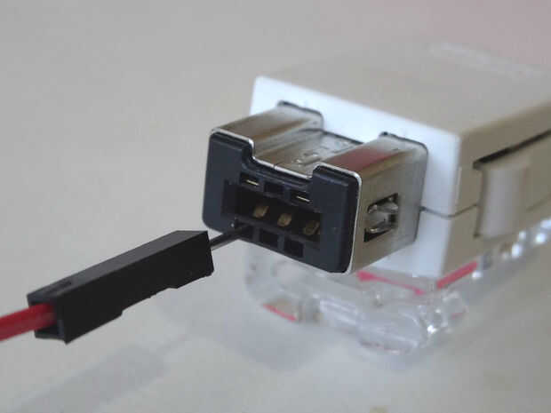 Wii Nunchuck controlador utiliza interfaz I2C. Cuadro 1 muestra los pines I2C del conector del regulador de Wii Nunchuck. El conector no está diseñado para conectar los cables a él, pero para ser sumergido en otro conector especialmente diseñado, sin embargo hay una manera fácil de conectar los cables de puente macho en ella. El conector tiene pequeñas aberturas al lado de las clavijas (foto 2), y mediante la inserción de la clavija de un cable de puente macho (foto 3), podemos hacer una conexión. También son especialmente diseñado adaptadores para los controladores de Wii Nunchuck, pero no tengo uno en el momento, así que he insertado los cables directamente.