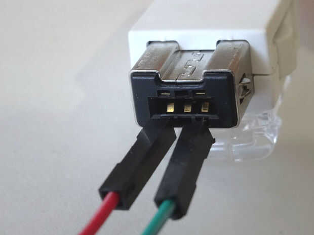 - Inserte el extremo macho de otro mujer hombre puente de alambre (cable verde) en la pequeña abertura abajo la Parte inferior derecha (SDA datos) pin (foto 4)