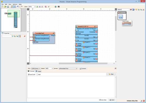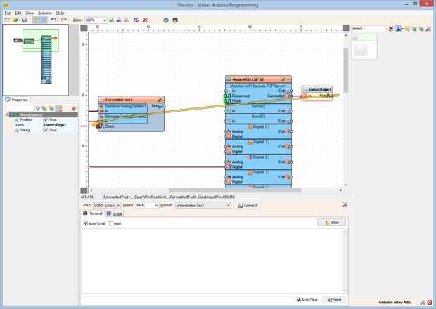 2. Conectar la clavija "conectado" de la "Modules.WiFi.Sockets.TCPServer1" del componente "NodeMCU ESP-12", en el "en" el pin del componente DetectEdge1 (foto 2)