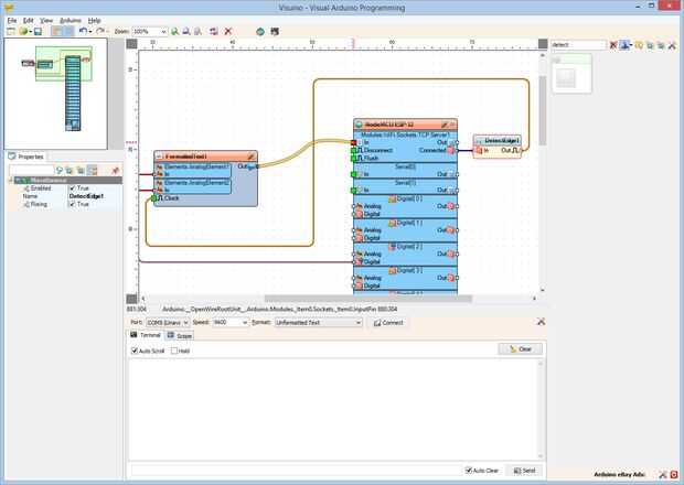 1. Conectar la clavija "a" del componente FormattedText1 en el pin "en" de la "Modules.WiFi.Sockets.TCPServer1" del componente "NodeMCU ESP-12" (foto 1)