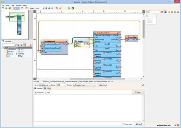 4. Conectar la clavija "a" del componente Delay1 en la clavija de entrada de "desconexión" de la "Modules.WiFi.Sockets.TCPServer1" del componente "NodeMCU ESP-12" (foto 4)