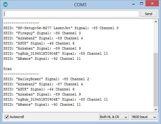 Si abres Terminal de serie en el IDE de Arduino o Visuino, verá los conexión Wi-Fi puntos descubiertos por el NodeMCU, su fuerza y su canal (foto 1)