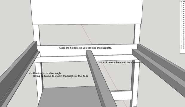 Para ahorrar espacio vertical, respaldo el borde delantero de los listones de la cama usando un ángulo de metal, en lugar de otro 4 x 4, y juntos había laminado la mesa de juntas, por lo que es bastante delgada, pero muy fuerte y rígida.