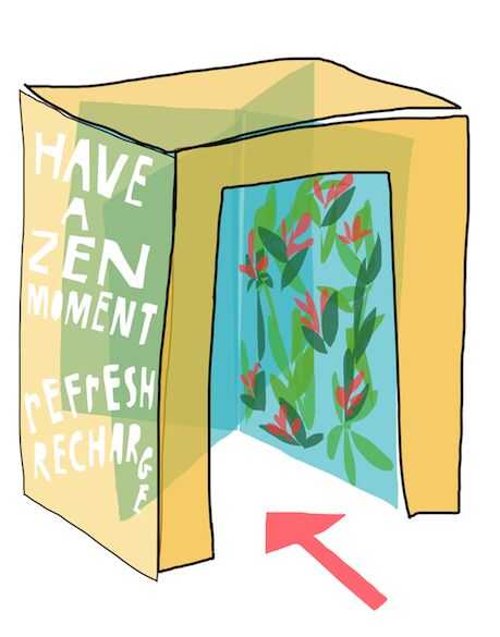Este es un diseño de espacio público, destinado a una calle ocupada de la ciudad. Es un espacio ritual, creando una experiencia tranquila y verde de un individuo a refrescarse, relajarse y reflexionar. Proporcionamos este instructable para una versión de este diseño, pero fácilmente puede ser adaptado con otros tipos de rituales y arreglos. El corazón del diseño es dar los transeúntes abrumado un descanso de la ciudad, guiándolos para respirar profundo y recargar ellos mismos.