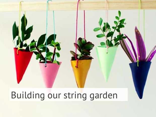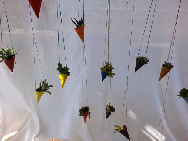 Nuestra pared de jardín de cadena se hizo utilizando macetas de barro hielo – cono de helado. Hicimos estos potes capaz de hornear arcilla de una tienda de artesanía, introducirlas en grandes triángulos, formar los triángulos en conos de helado, y luego hornear en el horno hasta que endurecieron. Entonces tomamos pequeñas suculentas y había plantado en las macetas de cono y rosca coloreada seda a través de las ollas para colgarlos.