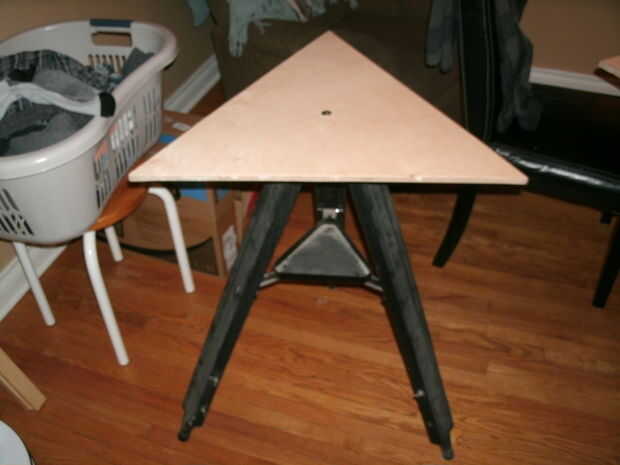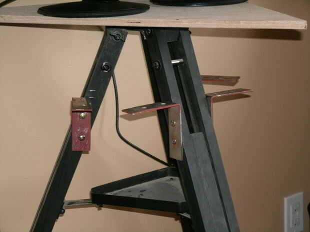 Tenía algunos soportes en L izquierda encima de una valla. Son viejas y muy sólido (no como en las tiendas estos días). Los soportes deben montarse con su tapa sentado nivel independientemente de su orientación. Elegí 30" desde el piso como todas las mesas y escritorios en la casa estaban a esa altura. El triángulo superior es aproximadamente 35" del suelo.
