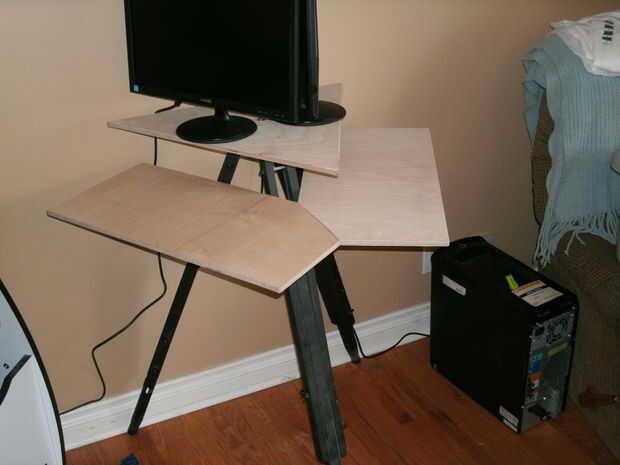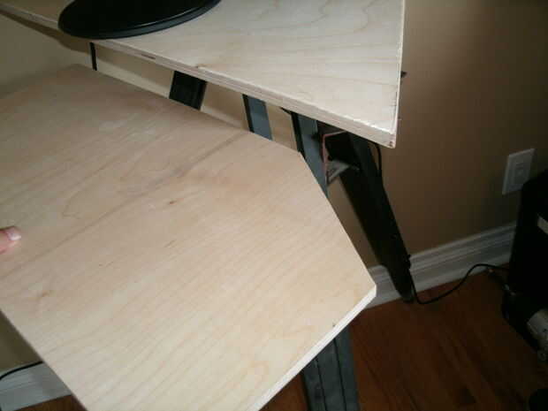 Usé una escuadra de carpintero para averiguar el corte elegante en el borde delantero de las bandejas de teclado. Puse un plano soporte debajo para estabilizar la articulación y relleno con masilla para madera. Una vez las bandejas en su lugar puse una pieza de 1 "x 2" a través de la espalda y utilizar mini-L-soportes para fijar el trípode y la parte inferior de la bandeja. Se puede ver en las fotos en el siguiente paso. Las bandejas de sensación muy robustas aun cuando estoy usando el teclado por lo que debe hacer frente a ellos bastante bien.