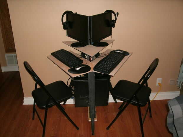 Creo que podría poner alguna pintura negra en las partes de madera peladas que he añadido al trípode por debajo de las bandejas de teclado. Te manchas y cera de la madera para resaltar la belleza de la madera. La adición final podría ser una UPS pequeña que puedo desconectar y mover a un enchufe de nuevo sin tener que reiniciar.