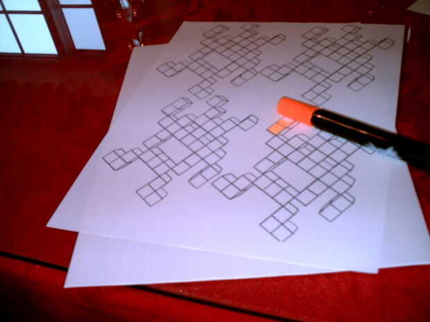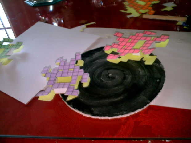 El objetivo principal para el tirador consisten en extranjeros que giran alrededor de una rueda en el interior de la caja. La intención era crear básicamente una noria en el que extranjeros papel giran en un disco circular que gira desde el calor de una luz negra que también hace que los alienígenas a brillar. En primer lugar, había forrado el interior de la caja de cartón con papel de construcción negra en la espalda y los lados. Usé papel naranja para lo que haría que la planta o parte inferior de la escena de arcade. Luego, corté un círculo de Junta de espuma de poliestireno negro así que no sería visible en la parte posterior de la caja. Usando mi impresora en papel cartulina impresos extranjeros que el blanco. Decidí hacer los extraterrestres más dimensional doblando el papel para que el extranjero tenía un espesor de 3. Esto puede hacerse por impresión de la misma forma alienígena dos veces y dejando una aleta para sujetar el corte dos salidas juntos. Utiliza marcadores fluorescentes para colorear los aliens para que le brillan a la luz de la negra-luz. < br >< img src = "http://farm6.static.flickr.com/5144/5582821919_9c8c8e7f3d.jpg" width = "500" height = "375" alt = "PICT0051" >< br >
