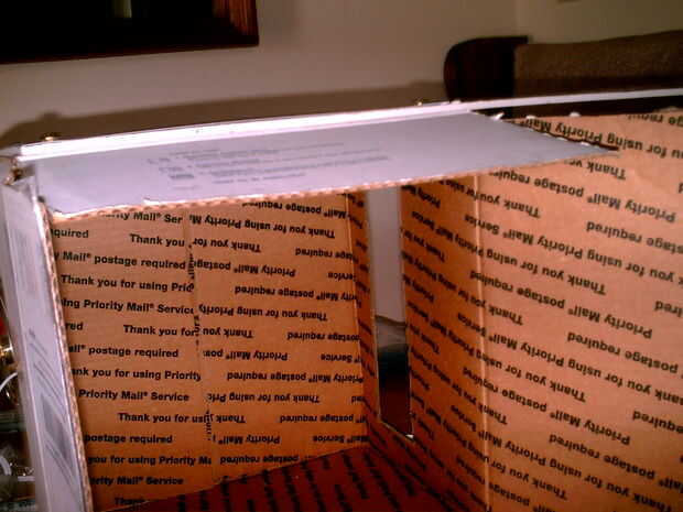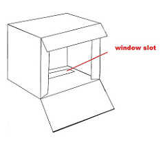 Corte una hendidura a lo largo de los lados de la caja que formará el fondo de la escena de arcade (no la parte inferior de la caja, pero el lado que se convertirá en la parte inferior de la escena de arcade) es aproximadamente de 2-2 1/2 pulgadas de ancho aproximadamente una pulgada desde la parte inferior de la caja.  Esta ranura es donde brillará la luz de la luz negra en la escena de la arcada.
