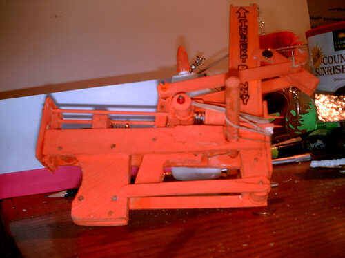 El primer paso de este Instructable es la creación de la pistola de Penny Shooter. ¿Si lo desea, puede sustituir una variación más simple de una banda de caucho pistola o un arma de juguete comprado, pero donde es el reto en? Hay varias partes en esta arma que debe encajar exactamente para funcionar correctamente. El arma de este juego hace de este arcade de un arcade real con monedas. Para la pistola, quería crear algo que dispararían un centavo sin que la persona que constantemente cargar otro centavo después de cada disparo para recrear la sensación de un arcade de disparos. Mientras que sería relativamente fácil crear una ballesta que encendería un solo centavo, lo recarga automática fue el primer reto de este proyecto. Para inspiración, miré en el funcionamiento de la ballesta repetición chino antiguo llamado el Cho Ko Nu. Lamentablemente, no se adapta perfectamente a la tarea de tirar monedas de un centavo. Después de algunos trabajos, se me ocurrió la idea de insertar las monedas en una ranura de moneda que caería la moneda abajo uno a uno a donde se pegaban por un palo como el arco de lanza. Como el arco es tirado hacia atrás, la siguiente moneda cae en su lugar. Mi primer intento en este diseño no cuenta alguien con que la ballesta inclinado hacia abajo que causa todas las monedas para derramarse. Para modificar el diseño, he creado una pequeña puerta que se abre sólo después de que el gatillo. Esto permite que la pistola para ser cargado en cualquier posición sin las monedas caer hacia fuera. Por desgracia, el primer diseño de la puerta causada la moneda al golpear la puerta de balanceo cambiando la trayectoria de monedas abajo. El diseño siguiente, mientras claro el arco de las monedas, aún dejó las monedas caen. Encontrar el equilibrio perfecto entre abrir la puerta de trampa lo suficientemente rápido para eliminar la moneda mientras que manteniéndolo cerrado lo suficiente evitar que las monedas caigan toma un montón de ensayo y error no a mencionar varias botellas de la aspirina. A diferencia de una ballesta tradicional, he creado una pista para asegurarse de que el bastón, que pega las monedas golpea en exactamente el punto derecho a enviar un centavo con dos pinchos de bambú como la pista de vuelo. Porque usted debe golpear el lado de la perra y la perra debe estar en posición vertical, este proyecto requiere alguna precisión o bien las partes no se alinearán correctamente. La caída de la moneda en particular debe ser sólo ancho suficiente para sostener la peseta vertical con un agujero sólo lo suficientemente grande como para que la palanca para pasar a la perra. Si se trata de una fracción de un milímetro fuera, el palo golpeó la caída de la moneda en vez de la moneda y es probable que enviarlo volando fuera de la pistola.