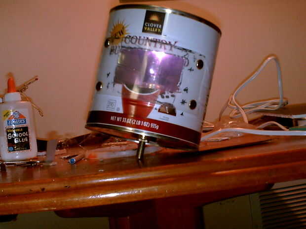 El siguiente paso fue perforar un agujero en la parte inferior de la lata de café y un agujero en la parte posterior. El agujero en la parte inferior llevará a cabo el tornillo de la lámpara que es parte de un kit de la lámpara de botella. El agujero en la parte trasera es donde entra el cable de la lámpara. Tome un pedazo de tubería plástica que es ligeramente más grande que el cable que viene con su kit de la lámpara y meterlo por el agujero que alojará el cable. Esta tubería protegerá el alambre de los bordes agudos del metal cortado.